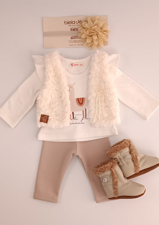 Conjunto Blusita Llamita, con leggins y chaleco de peluche para bebita
